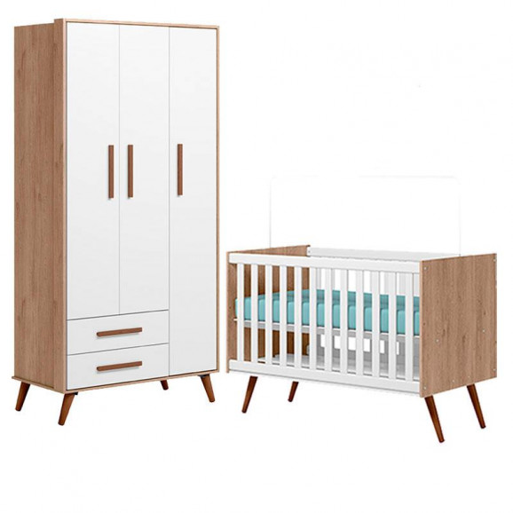 Berço Americano 3820 e Guarda Roupa Roupa 3830 Q Encanto Retrô Carvalho TOQ Rústico Branco - Qmovi