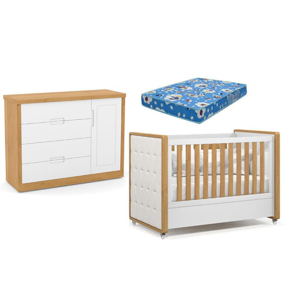 Berço Americano com Capitonê New Boucle e Cômoda Infantil Tutto New Freijó Branco Acetinado e Colchão Ortobom - Matic