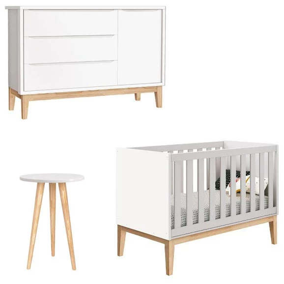 Berço Americano Cômoda 1 Porta Classic e Mesa de Canto Theo Branco com Pés Madeira Natural – Reller