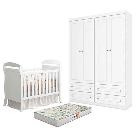 Berço Americano Danny Branco Acetinado Reller e Guarda Roupa 4 Portas Infantil Americano Branco HP com Colchão Gazin - Henn.