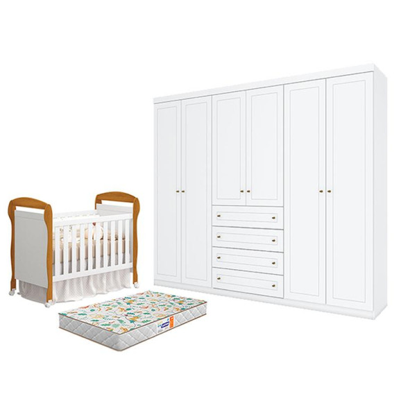 Berço Americano Danny Branco Acetinado Savana Reller e Guarda Roupa Casal Americano 6 portas Branco HP com Colchão Gazin - Henn.