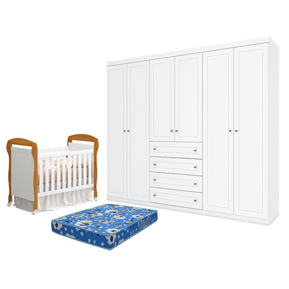 Berço Americano Danny Branco Acetinado Savana Reller e Guarda Roupa Casal Americano 6 portas Branco HP com Colchão Ortobom - Henn.