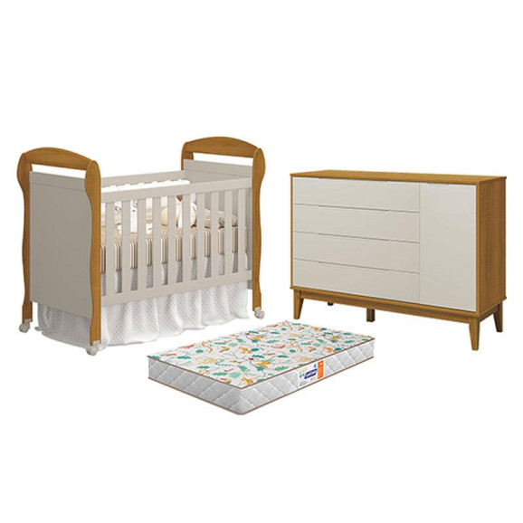 Berço Americano Danny com Colchão Gazin e Cômoda com Porta Elfe Classic Areia Savana Acetinado Amadeirado - Reller