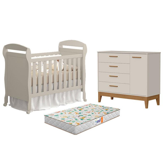 Berço Americano Danny com Colchão Gazin e Cômoda com Porta Flip Areia Acetinado - Reller