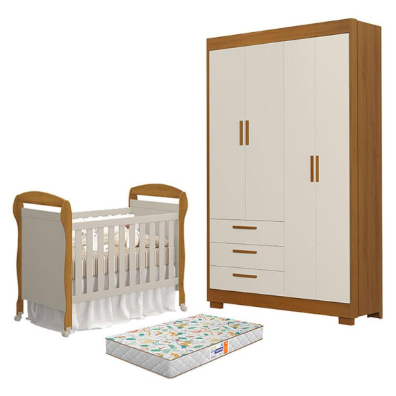 Berço Americano Danny com Colchão Gazin e Guarda Roupa 4 Portas Zaki Areia Savana Acetinado - Reller