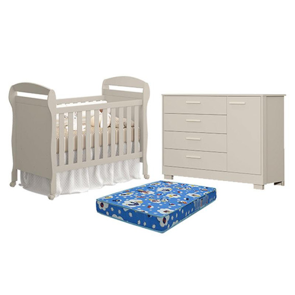 Berço Americano Danny com Colchão Ortobom e Cômoda com Porta Zaki Areia Acetinado - Reller