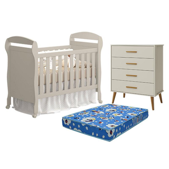 Berço Americano Danny com Colchão Ortobom e Cômoda Gaveteiro Isis Areia Acetinado - Reller