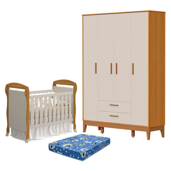 Berço Americano Danny com Colchão Ortobom e Guarda Roupa 4 Portas Flip Areia Savana Acetinado - Reller