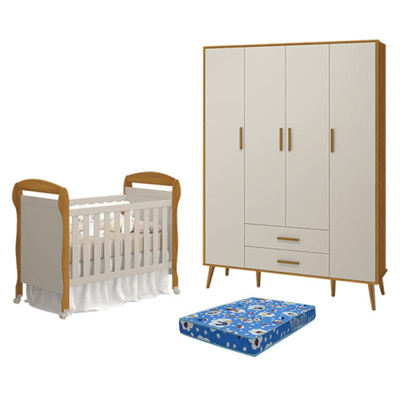 Berço Americano Danny com Colchão Ortobom e Guarda Roupa 4 Portas Isis Areia Savana Acetinado - Reller