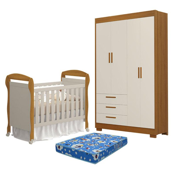Berço Americano Danny com Colchão Ortobom e Guarda Roupa 4 Portas Zaki Areia Savana Acetinado - Reller
