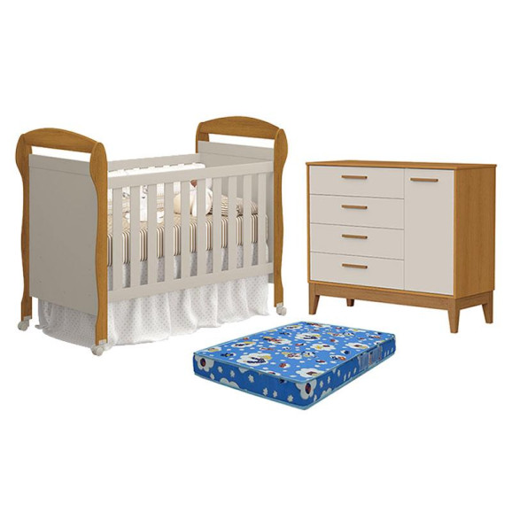Berço Americano Danny com Colchão Tend Tudo e Cômoda com Porta Flip Areia Savana Acetinado - Reller