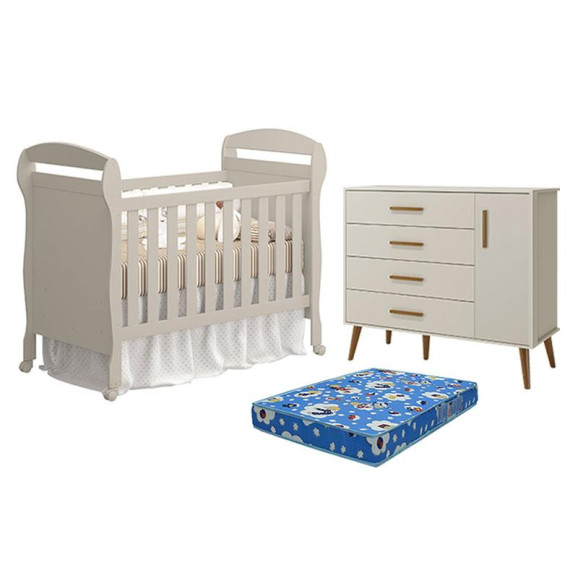 Berço Americano Danny com Colchão Tend Tudo e Cômoda com Porta Isis Areia Acetinado - Reller