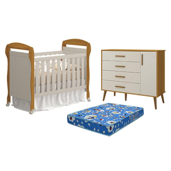 Berço Americano Danny com Colchão Tend Tudo e Cômoda com Porta Isis Areia Savana Acetinado - Reller