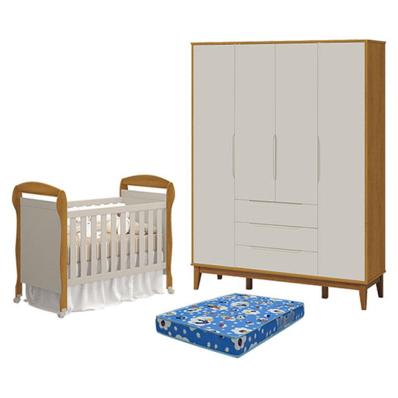 Berço Americano Danny com Colchão Tend Tudo e Guarda Roupa 4 Portas Elfe Areia Savana Acetinado Amadeirado - Reller