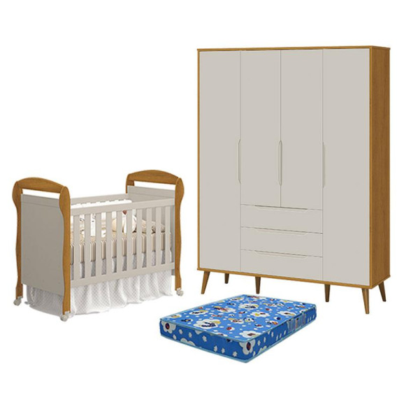 Berço Americano Danny com Colchão Tend Tudo e Guarda Roupa 4 Portas Elfe Retrô Areia Savana Acetinado Amadeirado - Reller