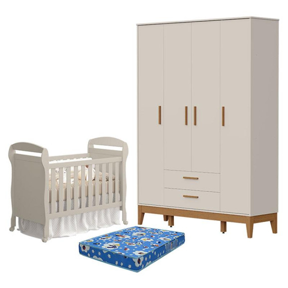 Berço Americano Danny com Colchão Tend Tudo e Guarda Roupa 4 Portas Flip Areia Acetinado - Reller