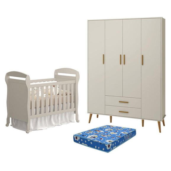 Berço Americano Danny com Colchão Tend Tudo e Guarda Roupa 4 Portas Isis Areia Acetinado - Reller