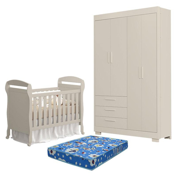 Berço Americano Danny com Colchão Tend Tudo e Guarda Roupa 4 Portas Zaki Areia Acetinado - Reller
