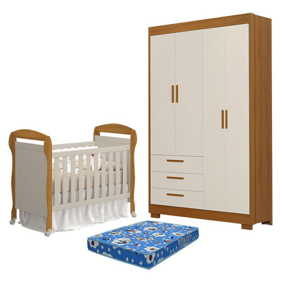 Berço Americano Danny com Colchão Tend Tudo e Guarda Roupa 4 Portas Zaki Areia Savana Acetinado - Reller