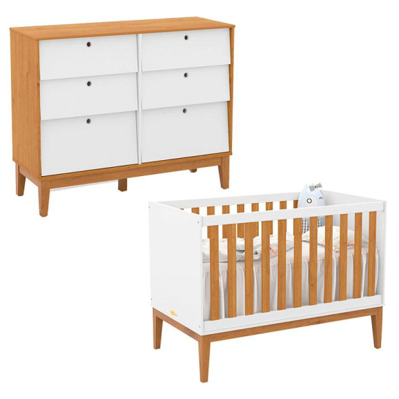 Berço Americano e Cômoda 6 Gavetas Unique Branco Soft Freijó Eco Wood - Matic