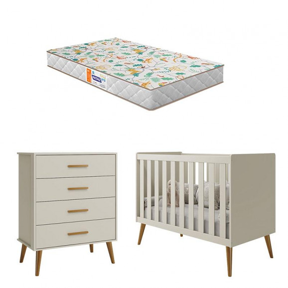 Berço Americano e Cômoda Gaveteiro Infantil Isis Areia Acetinado com Colchão Gazin - Reller