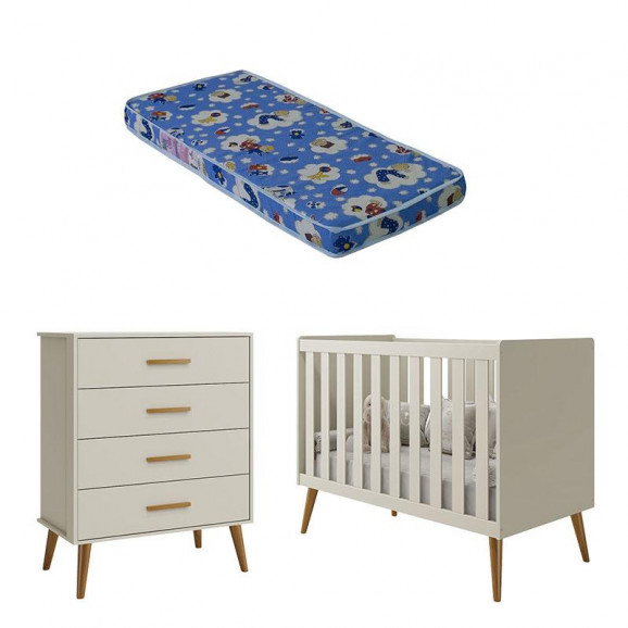 Berço Americano e Cômoda Gaveteiro Infantil Isis Areia Acetinado com Colchão Ortobom - Reller