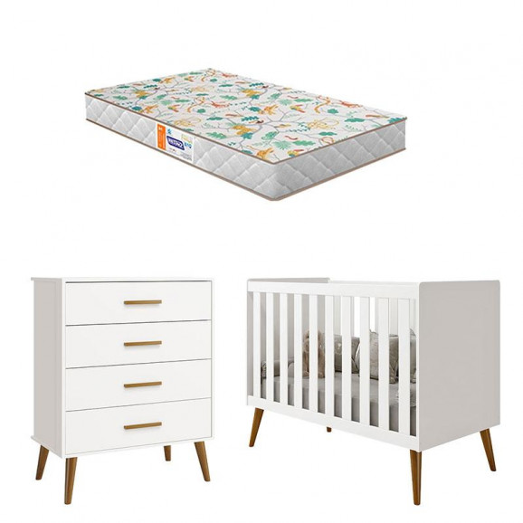 Berço Americano e Cômoda Gaveteiro Infantil Isis Branco Acetinado com Colchão Gazin - Reller