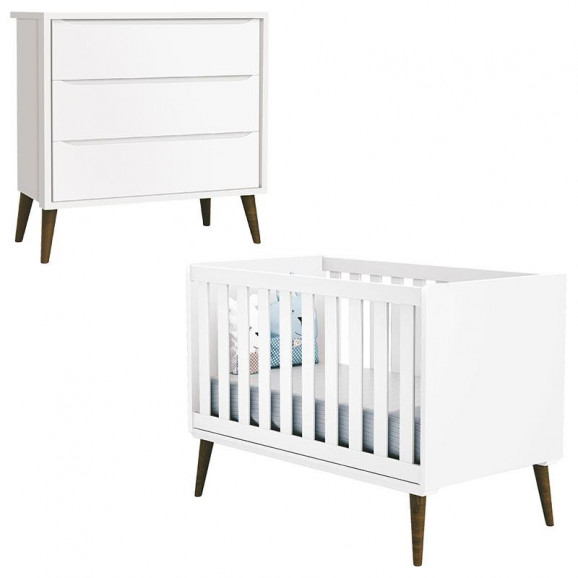 Berço Americano e Cômoda Gaveteiro Infantil Theo Branco Acetinado com Pés Amadeirados – Reller