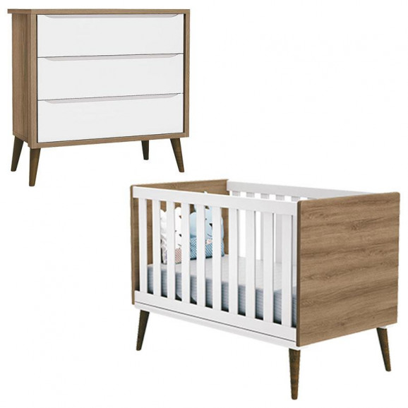 Berço Americano e Cômoda Gaveteiro Infantil Theo Branco Acetinado Mezzo Castani com Pés Amadeirados – Reller