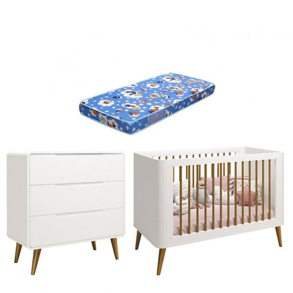 Berço Americano e Cômoda Gaveteiro Mila Branco Acetinado Amadeirado com Colchão Ortobom - Reller