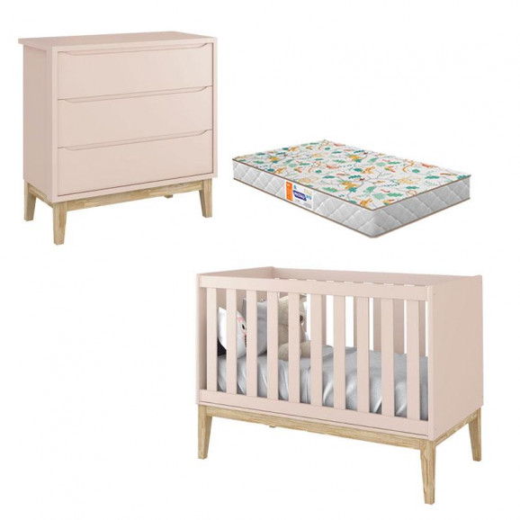 Berço Americano e Cômoda Gaveteiro New Classic Rosa com Pés Madeira Natural e Colchão Gazin – Reller