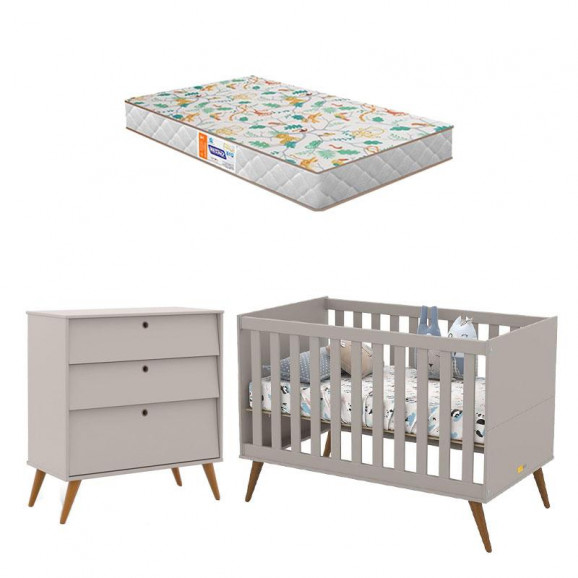 Berço Americano e Cômoda Gaveteiro Retro Gold Cinza Eco Wood com Colchão Gazin – Matic