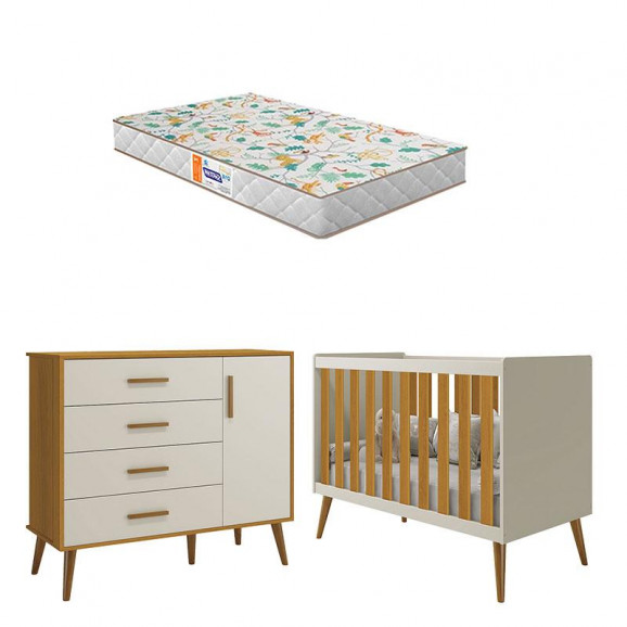 Berço Americano e Cômoda Infantil com Porta Isis Areia Acetinado Savana com Colchão Gazin - Reller