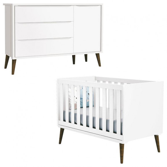 Berço Americano e Cômoda Sapateira Infantil Theo Branco Acetinado com Pés Amadeirado – Reller