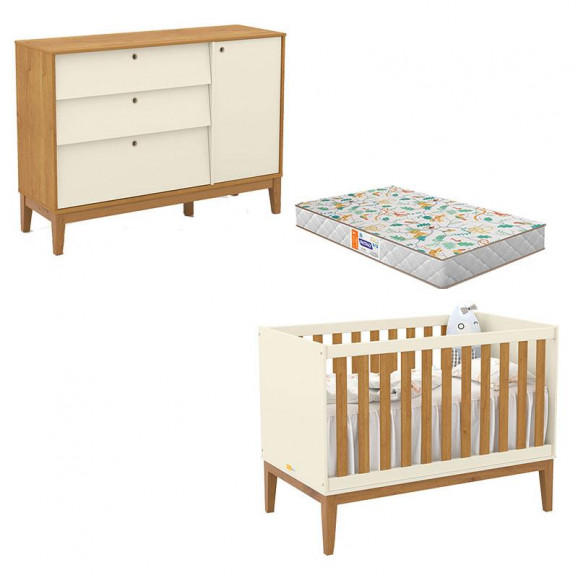Berço Americano e Cômoda Sapateira Off White Freijó Eco Wood com Colchão Gazin - Matic
