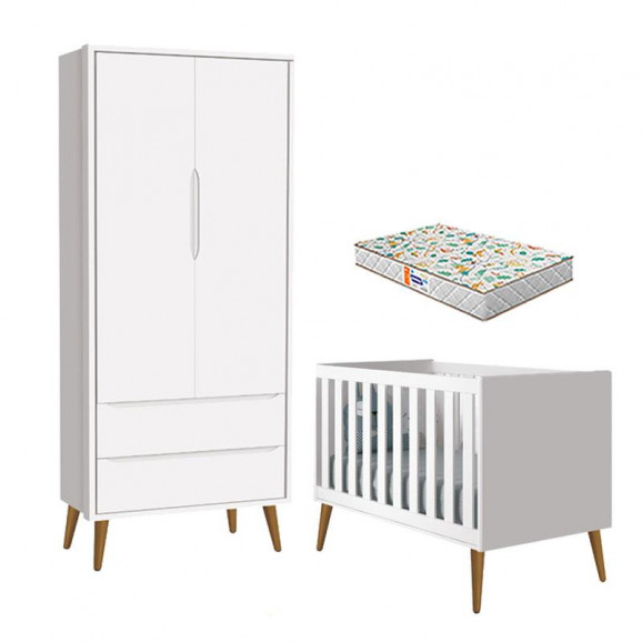 Berço Americano e Guarda Roupa 2 Portas Theo Branco Pés Amadeirados com Colchão Gazin – Reller