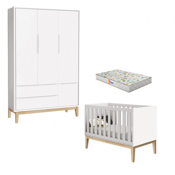 Berço Americano e Guarda Roupa 3 Portas New Classic Branco com Pés Madeira Natural e Colchão Gazin – Reller