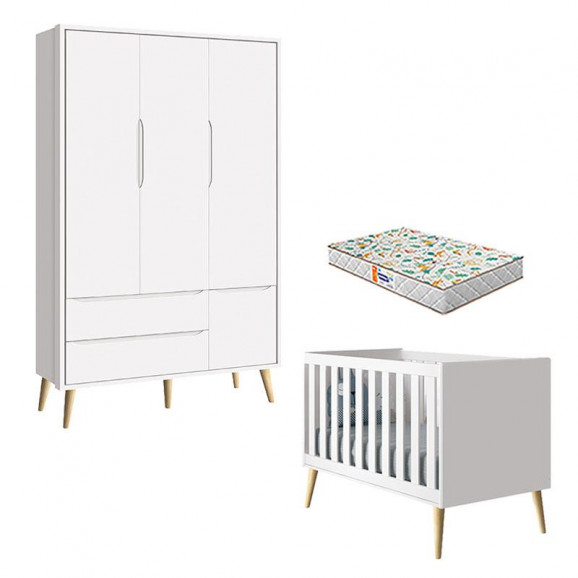 Berço Americano e Guarda Roupa 3 Portas Theo Branco Pés Madeira Natural com Colchão Gazin – Reller