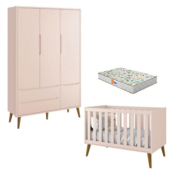 Berço Americano e Guarda Roupa 3 Portas Theo Rosa Pés Amadeirados com Colchão Gazin – Reller