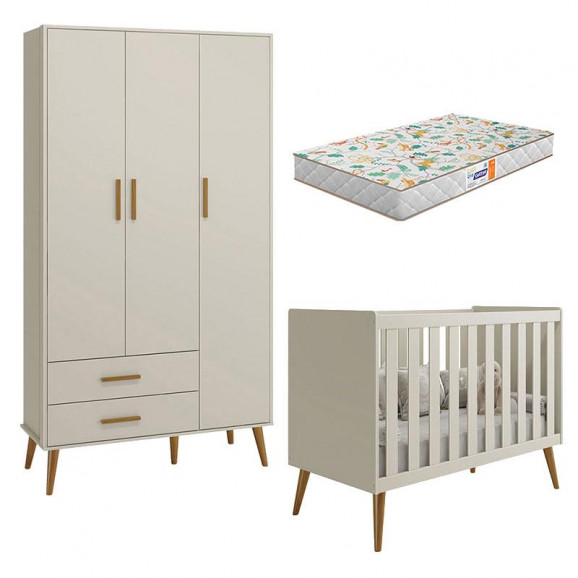 Berço Americano e Guarda Roupa Infantil 3 Portas Isis Areia Acetinado com Colchão Gazin - Reller
