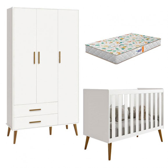 Berço Americano e Guarda Roupa Infantil 3 Portas Isis Branco Acetinado com Colchão Gazin - Reller