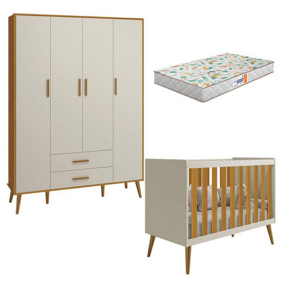Berço Americano e Guarda Roupa Infantil 4 Portas Isis Areia Acetinado Savana com Colchão Gazin - Reller