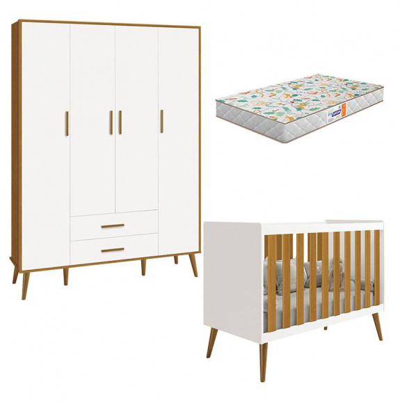 Berço Americano e Guarda Roupa Infantil 4 Portas Isis Branco Acetinado Savana com Colchão Gazin - Reller