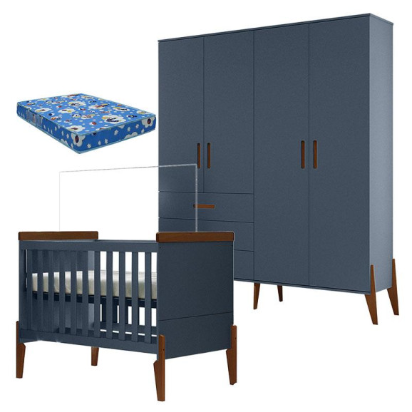 O quartinho do bebê dos seus sonhos você encontra aqui, apresentamos o Guarda Roupa Infantil 4 Portas que conta com amplo espaço interno e ótimas repartições para melhor organizar as roupinhas sapatinhos e acessórios do baby, e o Berço Americano ambos da linha Emilly foi desenvolvido pela Canaã com todo amor, cuidado e carinho para melhor lhe atender, fabricado com materiais de excelentes qualidades para maior durabilidade, resistência e segurança, com um lindo design na cor Azul com pés e detalhes na cor Magno proporcionando modernidade e um fino toque ao quartinho do seu pequeno, e ainda acompanha Colchão da Ortobom. Confira e aproveite!