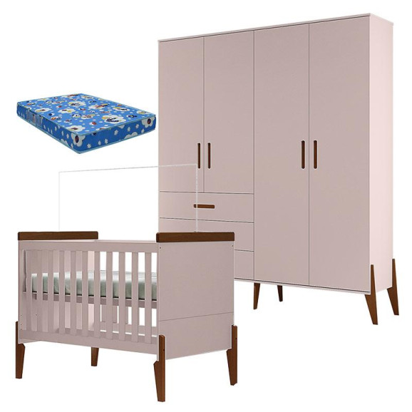 Berço Americano e Guarda Roupa Infantil Emilly Rose Magno com Colchão Ortobom- Canaã