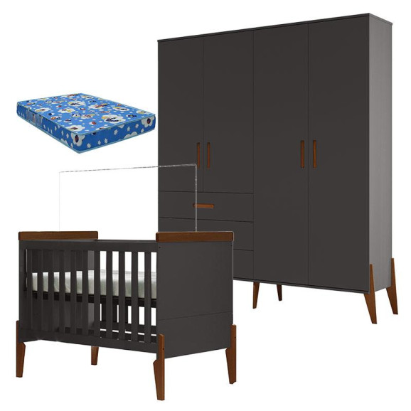 Berço Americano e Guarda Roupa Infantil Emilly Titanium Magno com Colchão Ortobom- Canaã