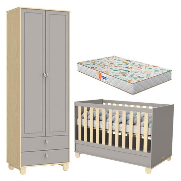 Berço Americano e Guarda Roupa 2 Portas Natural Cinza Rope com Colchão Gazin – Matic