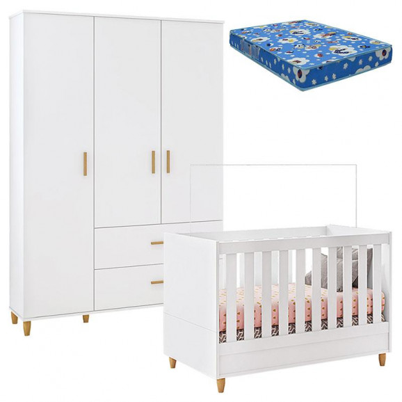 Berço Americano e Guarda Roupa Retro Milka 3 Portas Branco Acetinado com Colchão – Móveis Estrela