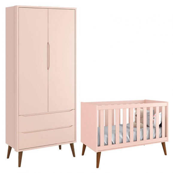 Berço Americano e Guarda Roupa Theo 2 Portas Rosa com Pés Amadeirados – Reller