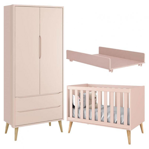 Berço Americano e Guarda Roupa Theo 2 Portas Rosa com Pés Madeira Natural com Trocador Juju – Reller